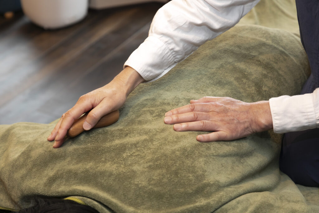 石や金属とは異なる、木ならではの自然なぬくもりが特長です。力で押すのではなく、圧をやさしく伝えながら筋肉の緊張をほどいていくため、「強い刺激は苦手」という方にも心地よく受けていただけます。施術を受けるうちに呼吸が深くなり、身体だけでなく気持ちまで静かにゆるんでいくのを感じていただけるはずです。